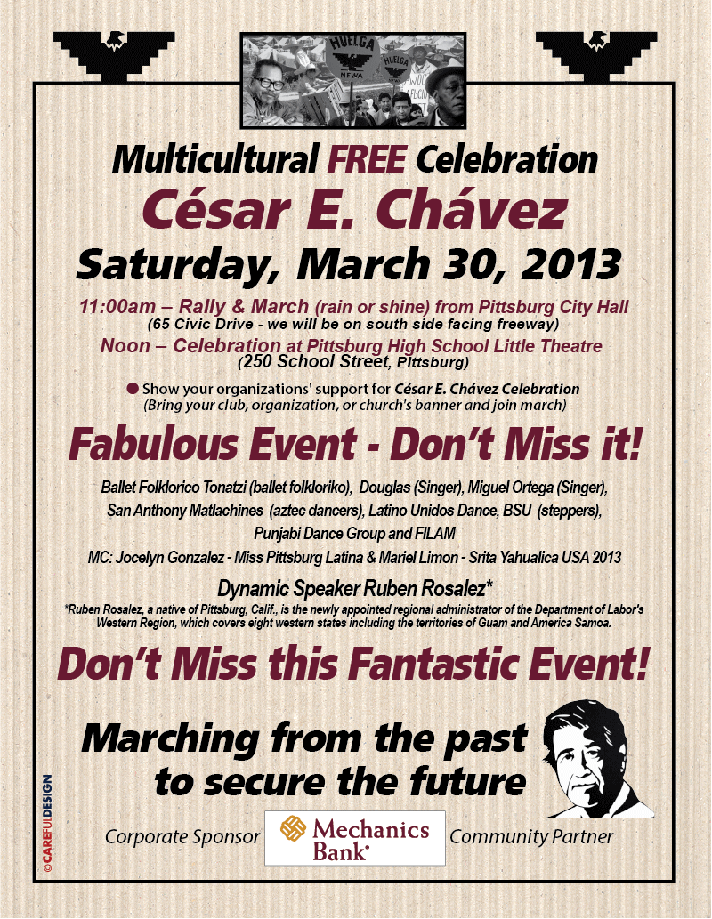 Local students and organizers plan to march in César Chávez's honor on his holiday Saturday, beginning with an 11 a.m. rally outside Pittsburg City Hall at 65 Civic Drive. That will lead to a noon celebration at Marina Vista Elementary School, near the corner of Eighth Street and Railroad Avenue.